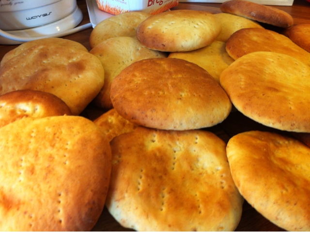 Tryck och kavla ut till platta kakor. Nagga och låt jäsa på plåt medan ugnen värms till 200-225*